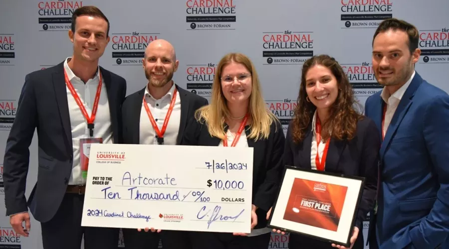 Finalists Artcorate knocked it out of the park with their first-place win, earning $10,000, and DoorOne earned second place and a $5,000 prize. FitSite won the event’s fast pitch competition, sponsored by UofL’s Center for Free Enterprise, bringing home $2,000. Cardinal Challenge winners Guerino Ascoli, Marco Bambek, Pascal Grün, Leoni Köhler, and Anna-Lena Volkmann shared their reactions when learning that Artcorate took the coveted title. “Actually, it was a huge surprise; I don’t think any of us would have thought we would have gotten first place,” noted Volkmann, CEO.