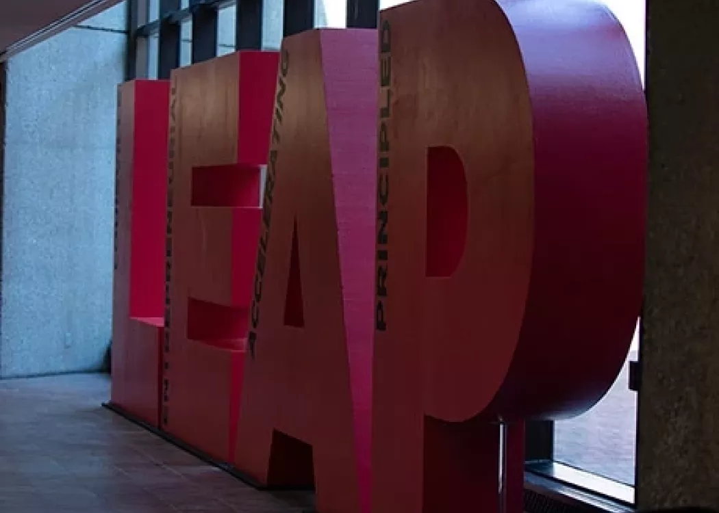 “We will be the example of building a business school that serves its constituents,” announced Dean Todd Mooradian in his impassioned remarks officially the unveiling four, nine-foot letters which make up LEAP, a sculpture representing th